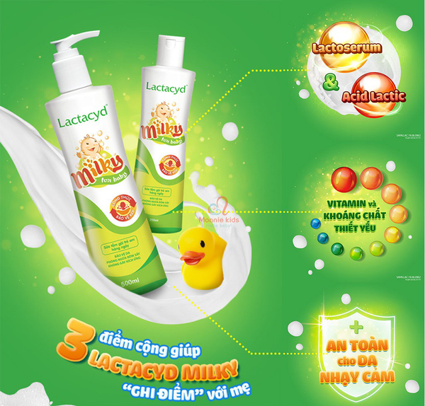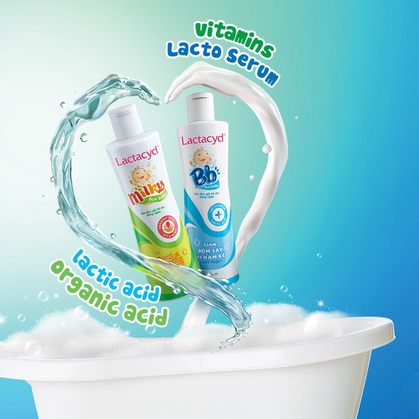 - Sữa tắm gội Lactacyd trị rôm sẩy và hăm kẽ và hăm kẽ, đồng thời nuôi dưỡng cho làn da bé thêm mịn màng.